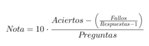 mínima necesaria para superarla y se calificará de apto o no apto. Los errores penalizan, conforme a lo fórmula siguiente: A – (E/ (n-1)), siendo “A” el número de aciertos, “E” el de errores y “n” número de alternativas de respuesta.b) Contestación por escrito en cincuenta minutos a un cuestionario de cien preguntas, con un enunciado y tres alternativas de respuestas de las que solo una es verdadera, relacionadas con el temario que figura como Anexo II a la presente convocatoria. Esta parte se calificará de cero a diez puntos siendo necesario obtener un mínimo de cinco puntos para aprobar. Los errores penalizan, conforme a lo fórmula siguiente: A – (E/ (n-1)), siendo “A” el número de aciertos, “E” el de errores y “n” número de alternativas de respuesta.