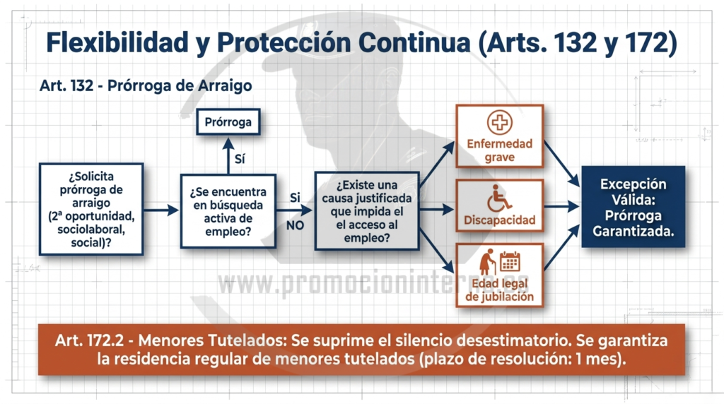 - Prórrogas de arraigo: Posibles sin requisito de búsqueda de empleo por enfermedad, discapacidad o jubilación.